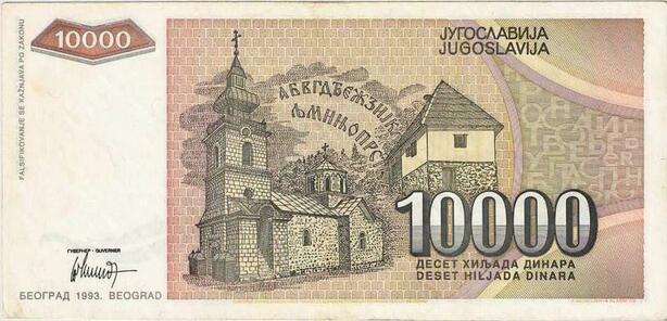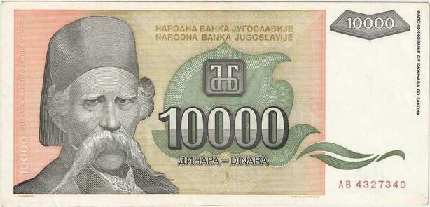 Q2296 Banknote Yugoslavia 10000 Dinara Vuk Stefanović Karadžić 1993 AU