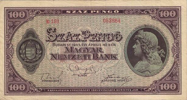 Q2621 Banknote Hungary 100 Pengő King Mátyás 1945 AU+ -- Make Offer
