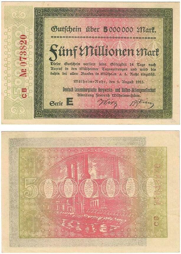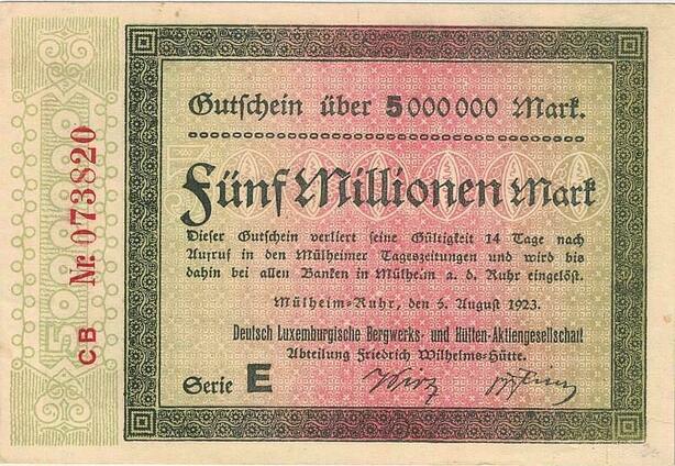 Q3463 German Luxembourg Mülheim Ruhr Mines Bergwerk 5 Million Mark 1923 UNC