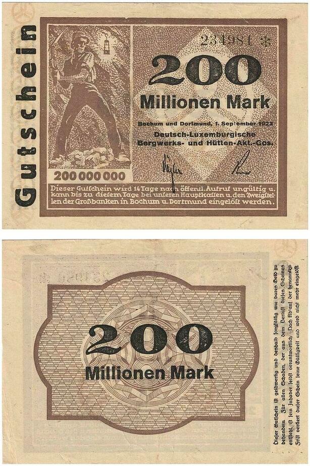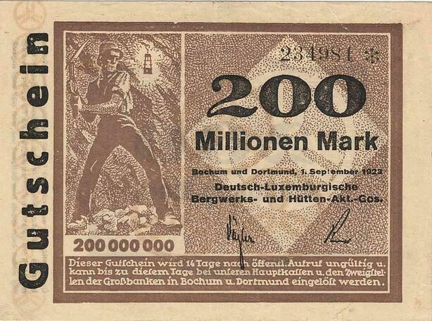 Q3473 German Luxembourg Bochum Dortmunt Mines Bergwerk 200 Million Mark 1923