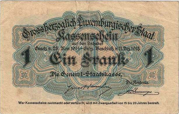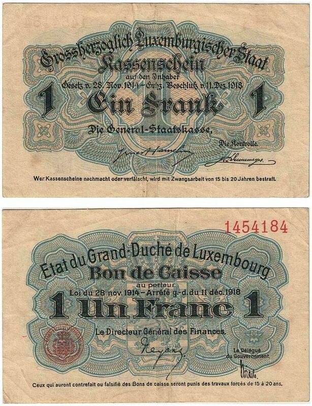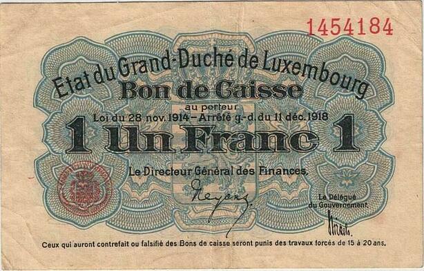 Q3481 Luxembourg Bon de Caisse 1 Franc Frank Loi 1914 1918 XF