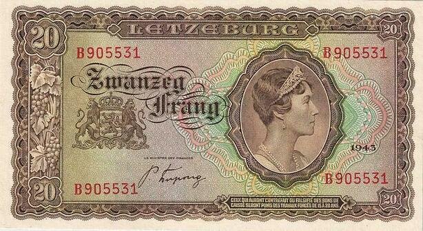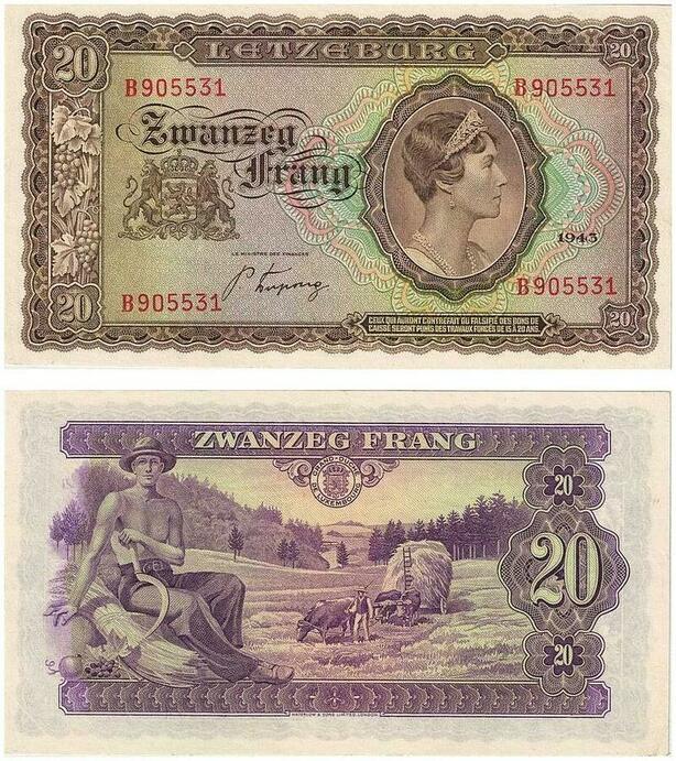 Q3500 Rare Luxembourg 20 Frang Francs Grand Duchess Charlotte 1943 UNC - Offer