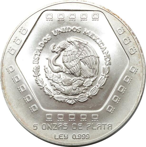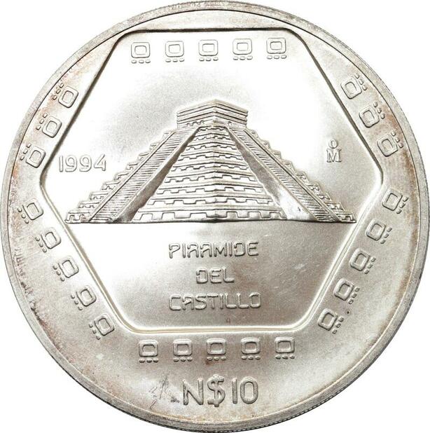 R0286 Rare Mexico 10 $ Dollars Piramide Castillo 5 oz Silver 1994 UNC