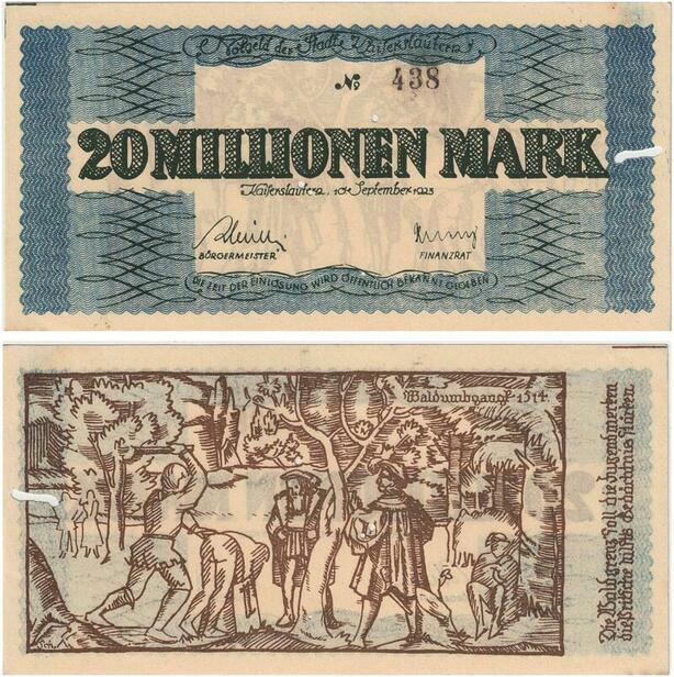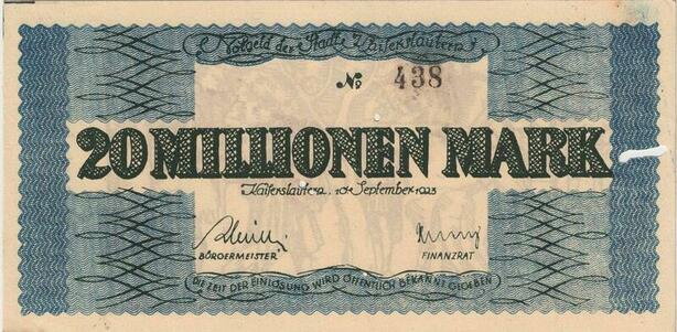 R0552 Rare Germany Banknote Kaiserslautern 20 Millionen Mark 1923 N°438 UNC