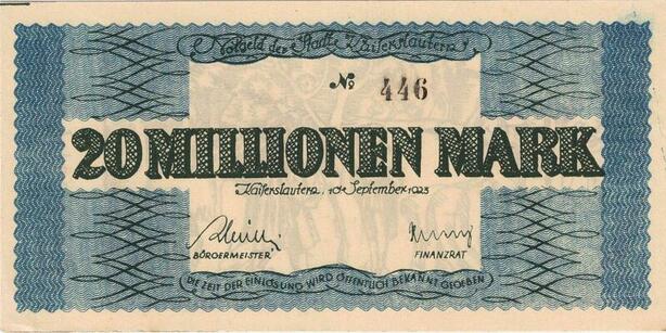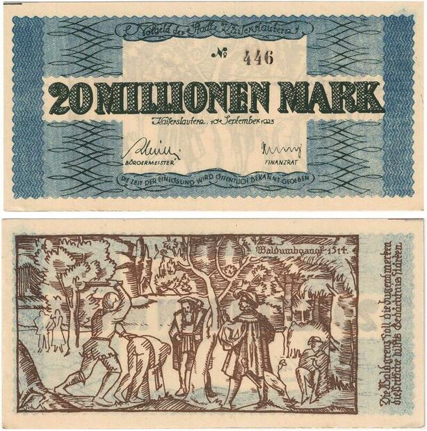 R0558 Rare Germany Banknote Kaiserslautern 20 Millionen Mark 1923 N°446 UNC