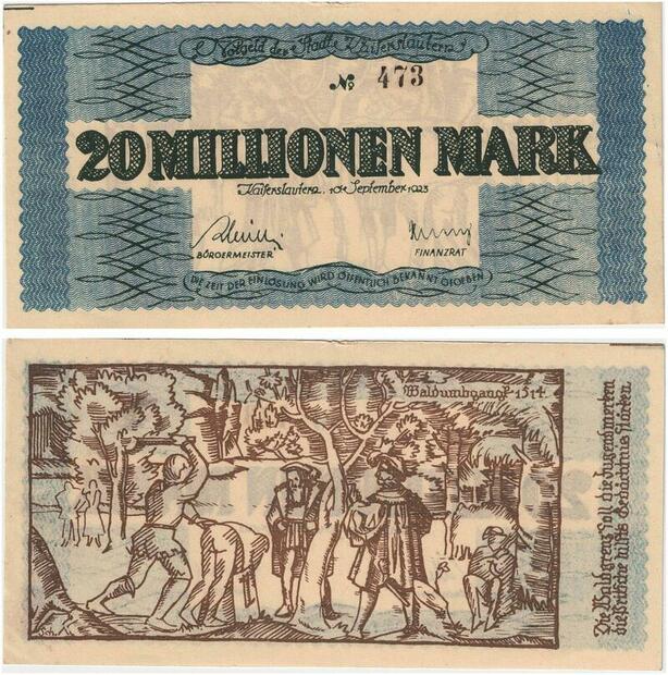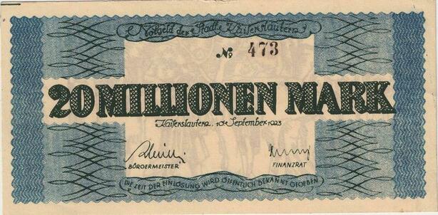 R0565 Rare Germany Banknote Kaiserslautern 20 Millionen Mark 1923 N°473 UNC