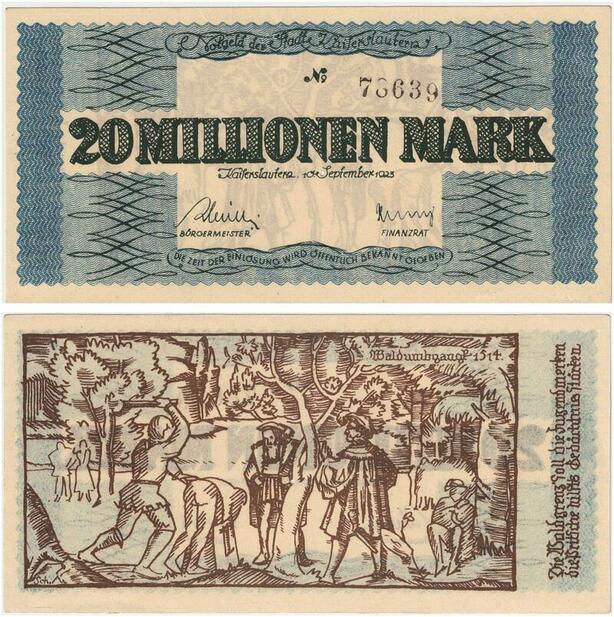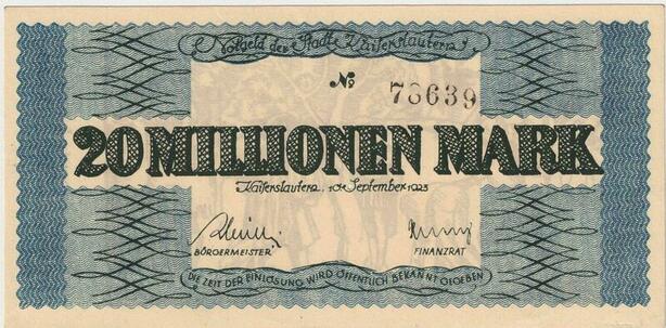 R0581 Germany Banknote Kaiserslautern 20 Millionen Mark 1923 N°78639 UNC