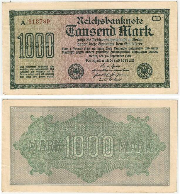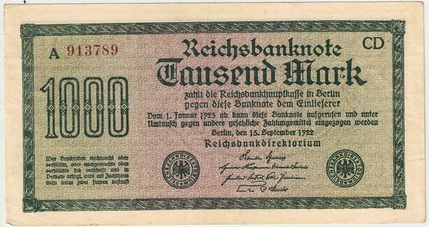 R0813 Germany Banknote Inflation 1000 Mark Red 1922 AU -> Make Offer