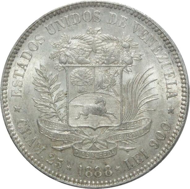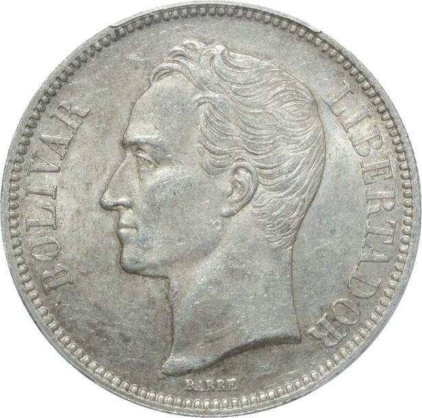 O25 2ND TOP POP Venezuela 5 Bolivares Barre 1888 Paris Silver PCGS AU58 SUP AU