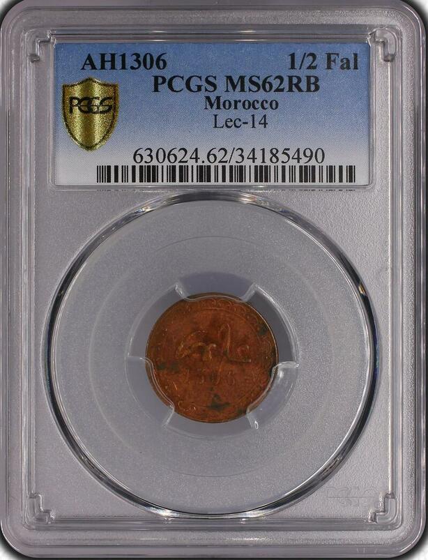 O549 Scarce Morocco Moulay Al-Hasan I 1/2 Falus AH 1306 1888 Fes PCGS MS62