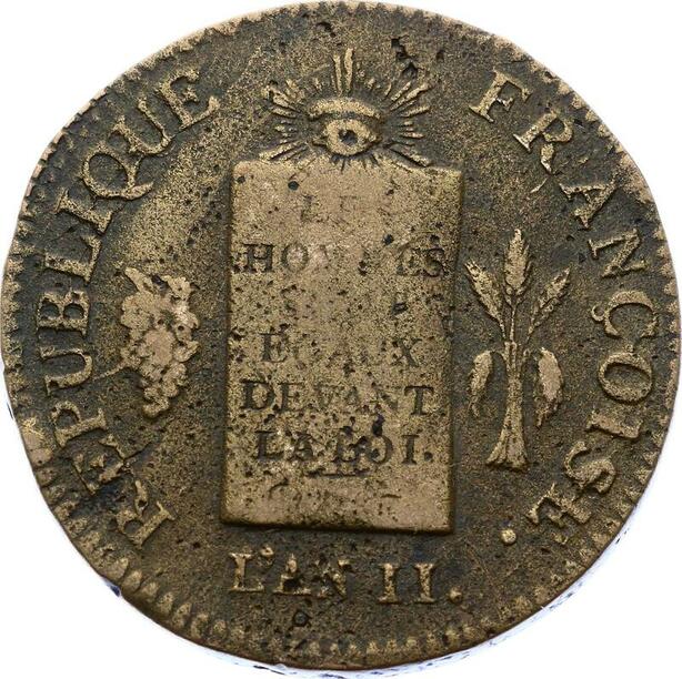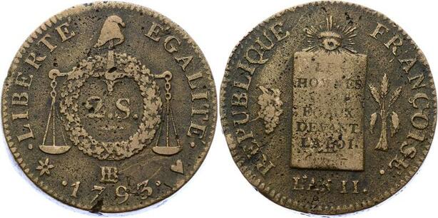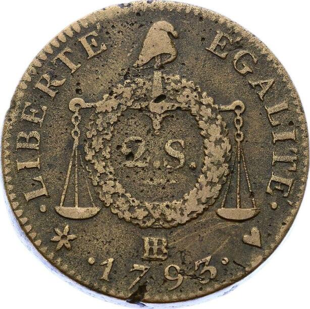 O2192 Rare Convention 2 Sols à la balance Louis XVI An II 1793 BB Strasbourg ->Make offer