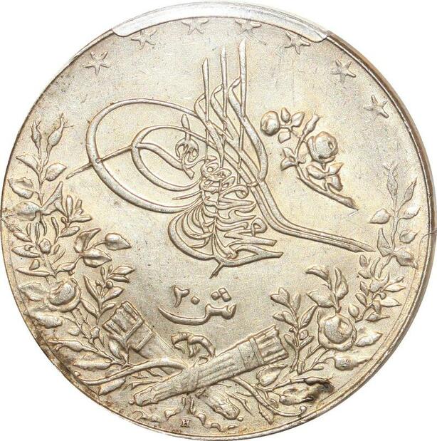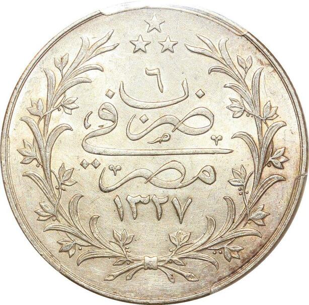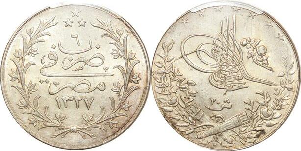 O7333 Scarce Egypt 20 Qirsh Muhammad V 1327 year 6 H Silver PCGS AU