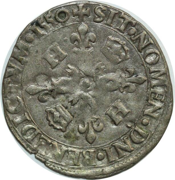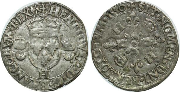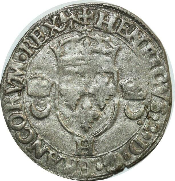 O7428 Rare France Douzain Henri II C couronnés 1550 H La Rochelle SUP