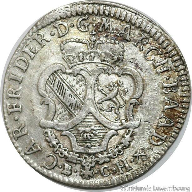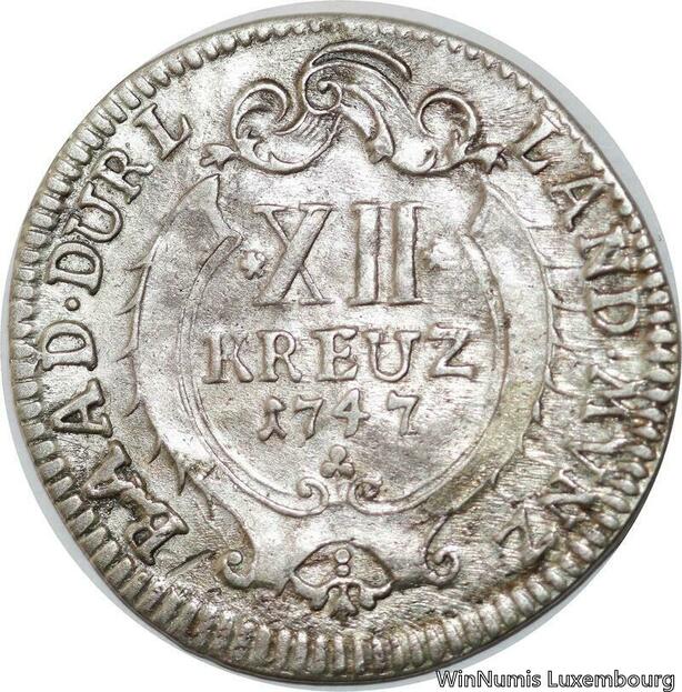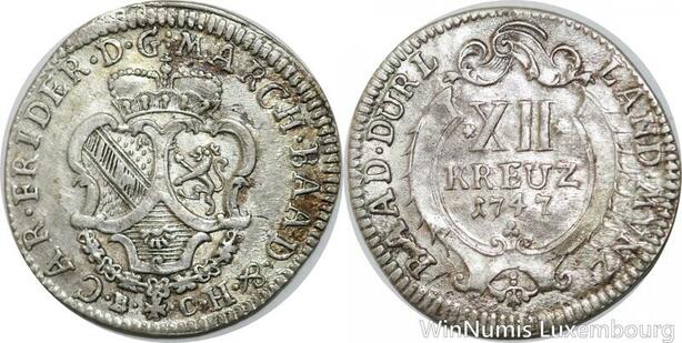 P8009 Rare Germany Baden Durlach 12 Kreuzer Karl Friedrich 1747 Silver AU