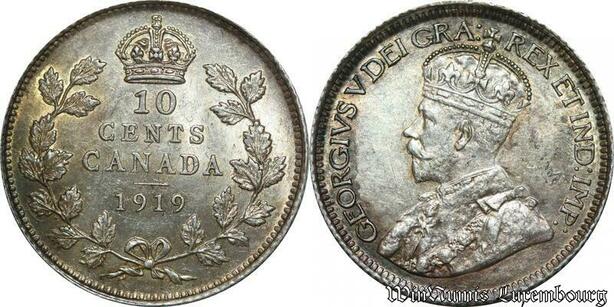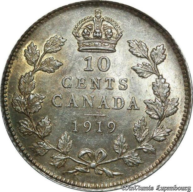 P8219 Rare Canada 10 Cents Georges V 1919 Silver UNC -> M Offer