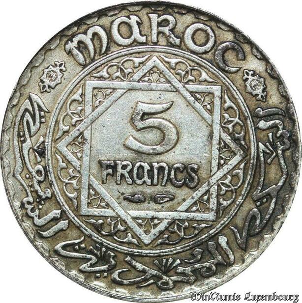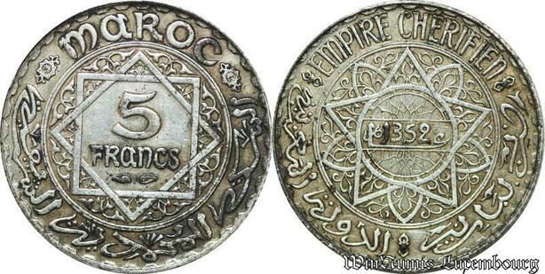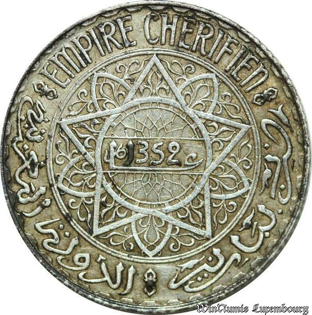 P8233 Maroc 5 Francs Empire Cherifien AH 1352 1933 Silver -> M Offer