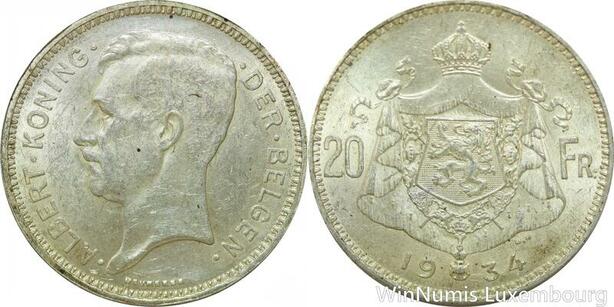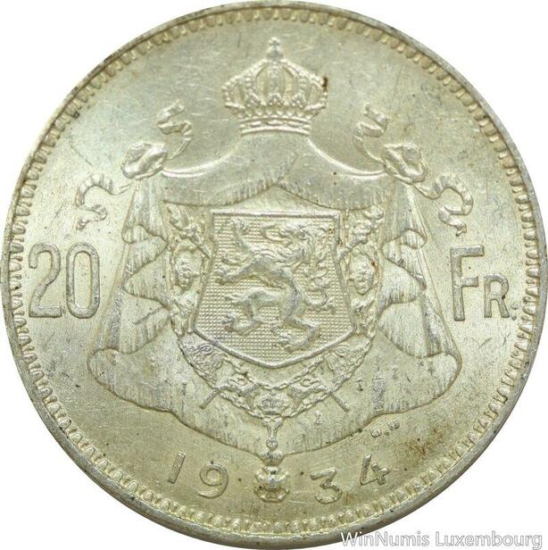 P8264 Belgium 20 Francs Albert I 1934 Silver AU -> M Offer