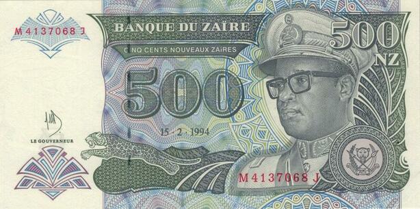 Banknote Zaire Congo 500 Nouveaux Zaires Mobutu Seko 1994 UNC