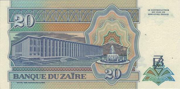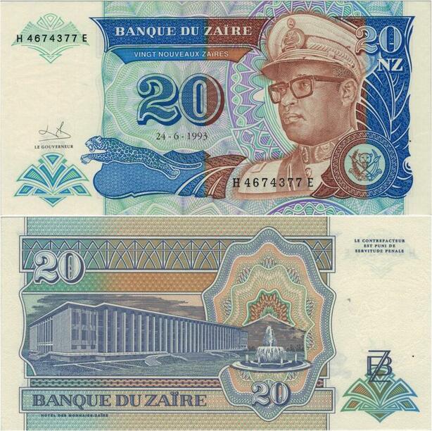 Banknote Zaire Congo 20 Nouveaux Zaires Mobutu Seko 1993 UNC