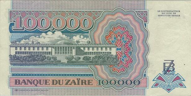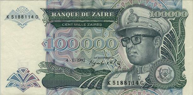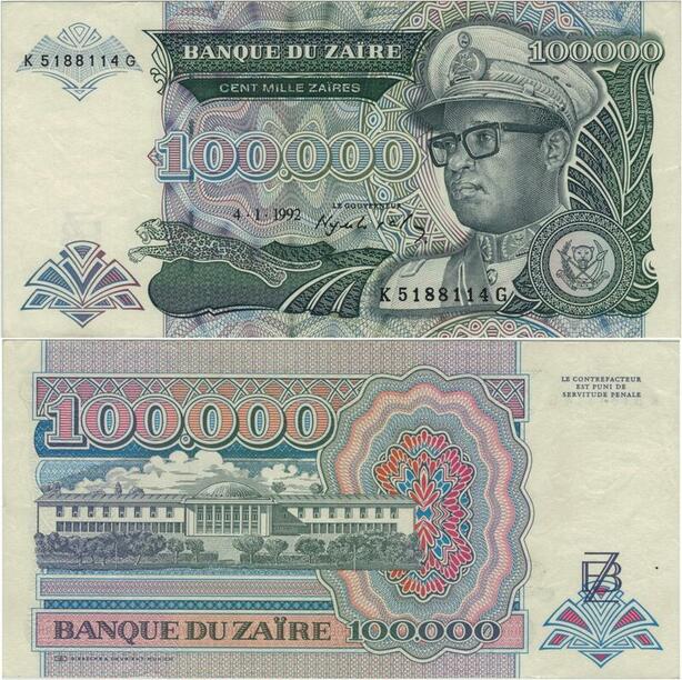Banknote Zaire Congo 100000 Zaires Mobutu Sese Seko 1992 UNC