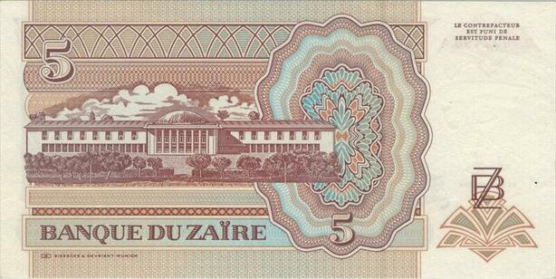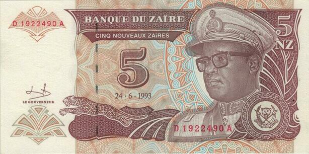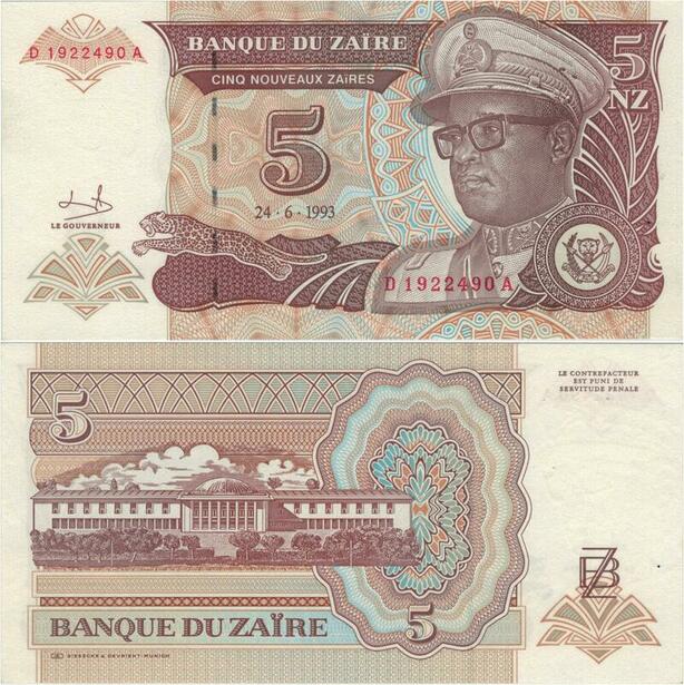Banknote Zaire Congo 5 Nouveaux Zaires Mobutu Seko 1993 UNC