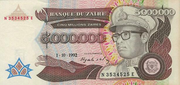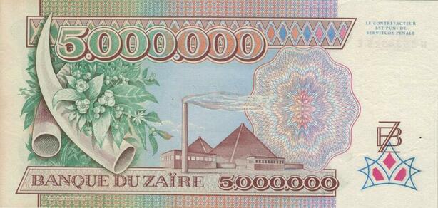 Banknote Zaire Congo 5 Millions Zaires Mobutu Seko 1992