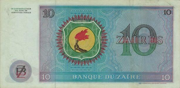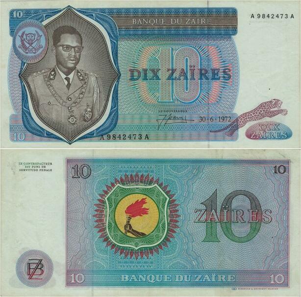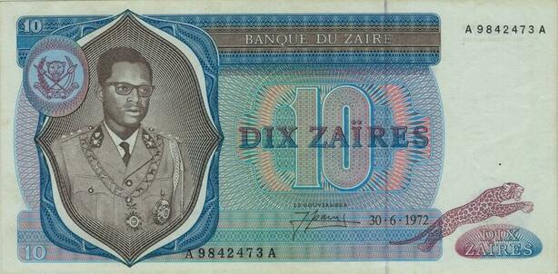 Banknote Zaire Congo 10 Zaires Mobutu Sese Seko 1972 AU+