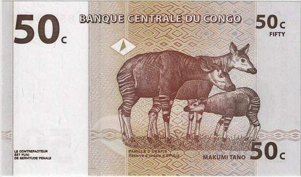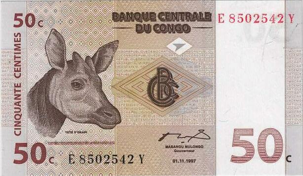 Q1638 Banknote Congo Démocratique 50 Centimes Okapi Epulu 1997 UNC -> Make offer