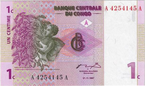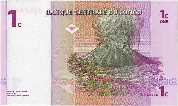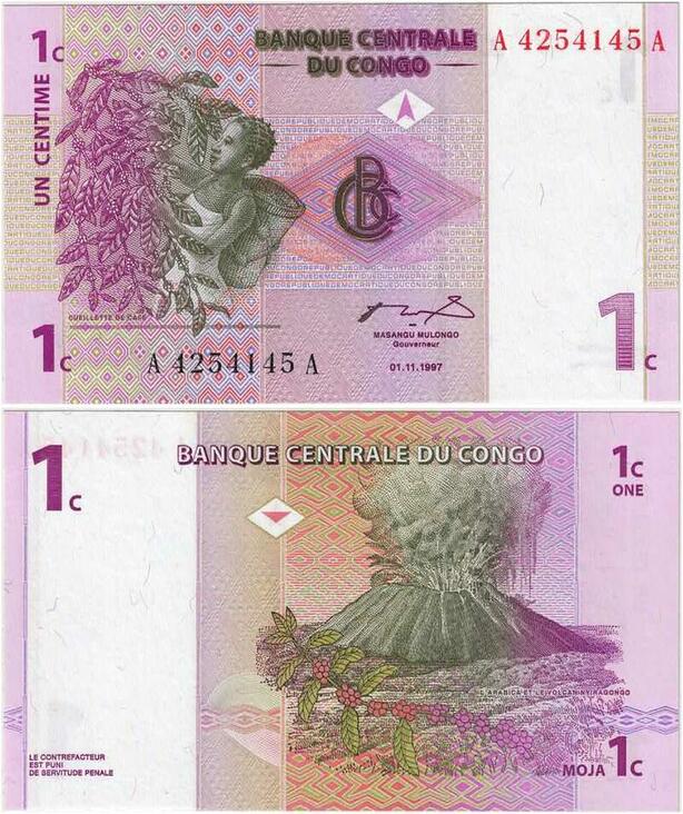 Q1646 Banknote Congo Démocratique 1 Centime Café Volcan Nyragongo 1997 UNC