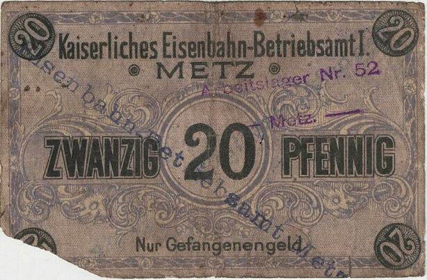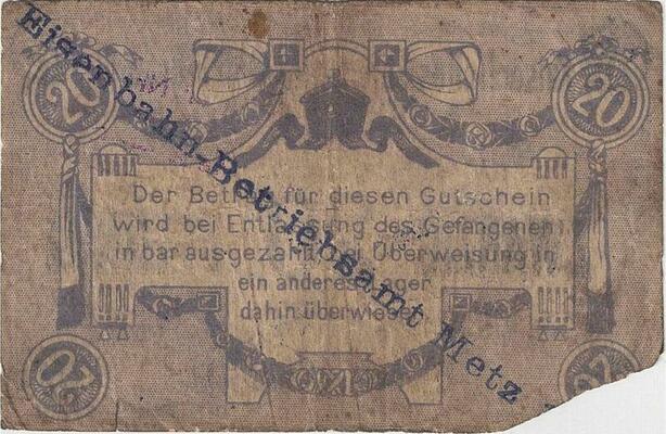 Q4263 Banknote Germany 20 Pfennig Kaiserliches Eisenbahn Betriebszmtl Metz 1914