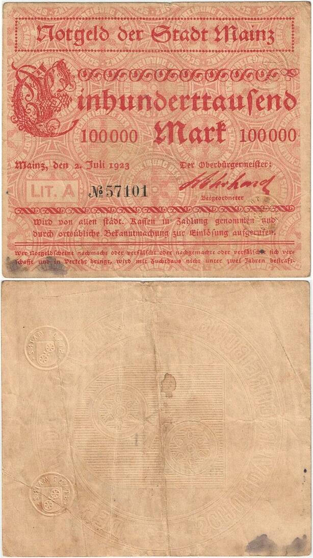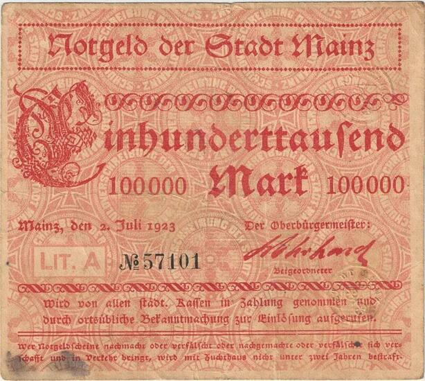Q4316 Banknote Germany 100000 Mark Ornament Mainz 1923 - Offer