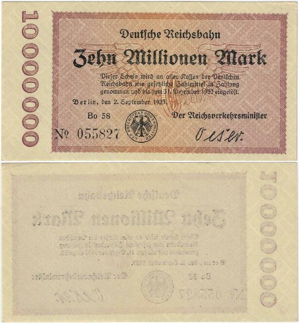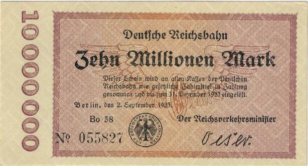 Q4386 Banknote Germany 10 Million Mark Uniface, Eagle, train Berlin 1923