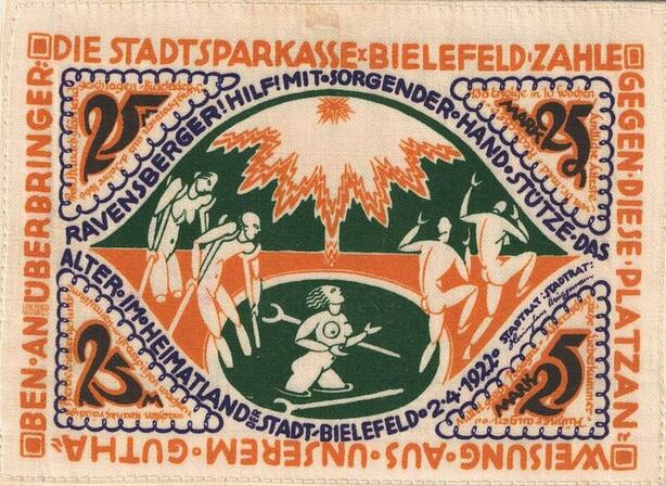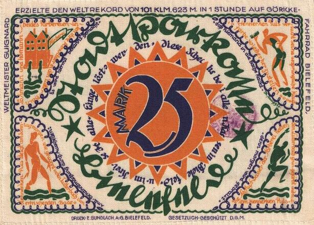 Q4455 Banknote Germany Bielefeld 25 Mark Silk Notgeld 1922 Counterstamped UNC