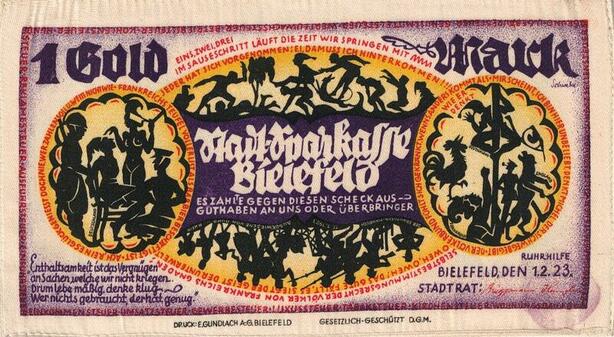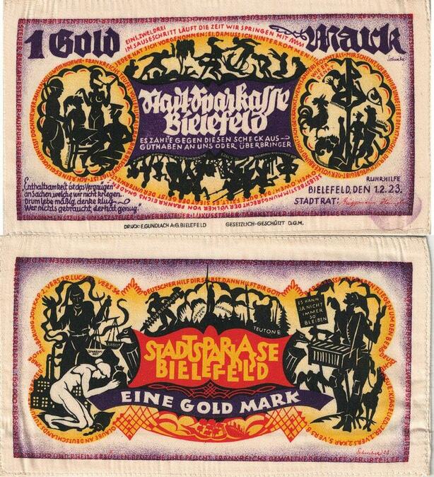 Q4456 Rare Banknote Germany Bielefeld Weimar 1 Gold Mark Notgeld 1923 Soie AU