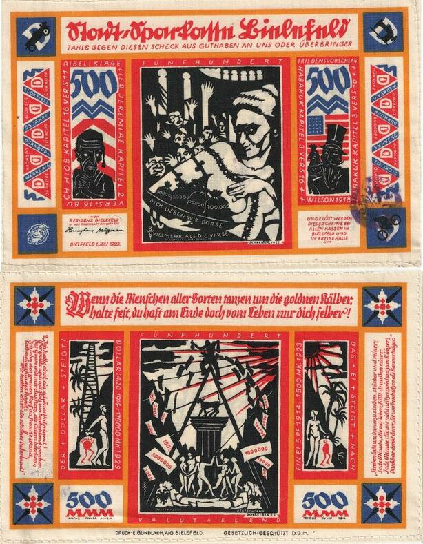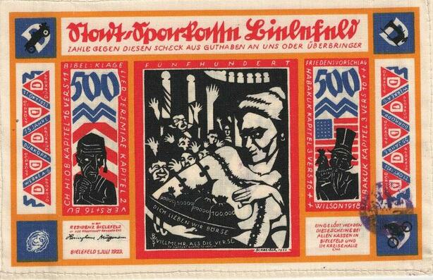 Q4459 Rare Banknote Germany Bielefeld 500 Mark Silk 1923 Soie Notgeld AU