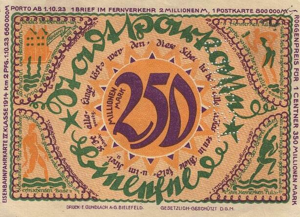 Q4466 Banknote Germany Bielefeld 250 Millionen Mark Perforation Rrüst 1923 AU