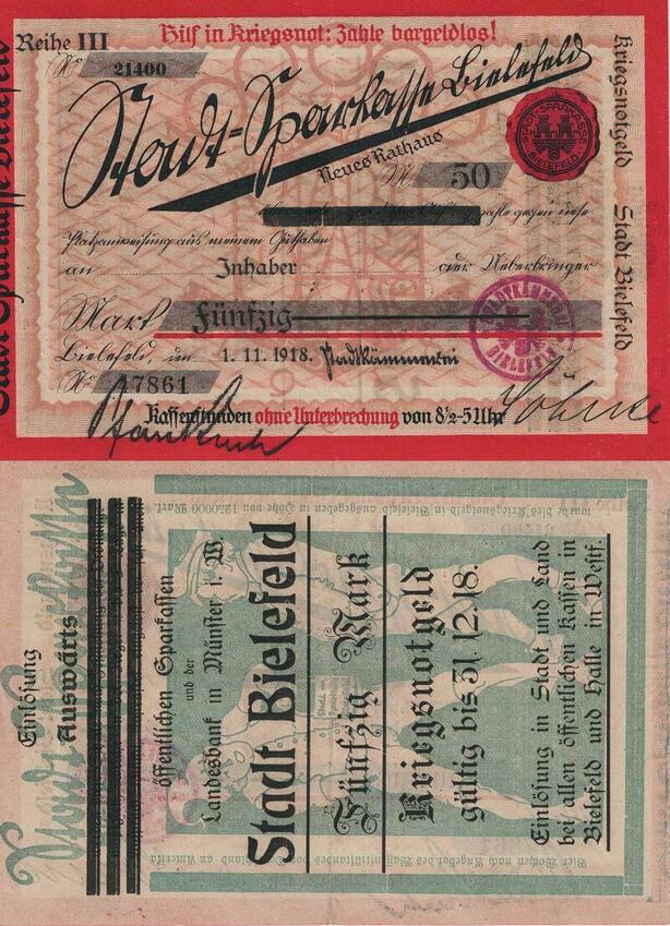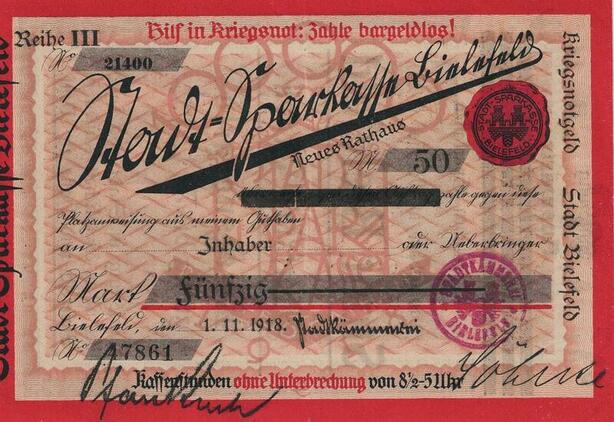 Q4470 Banknote Germany Bielefeld Stadt 50 Mark 1918 AU - Make Offer