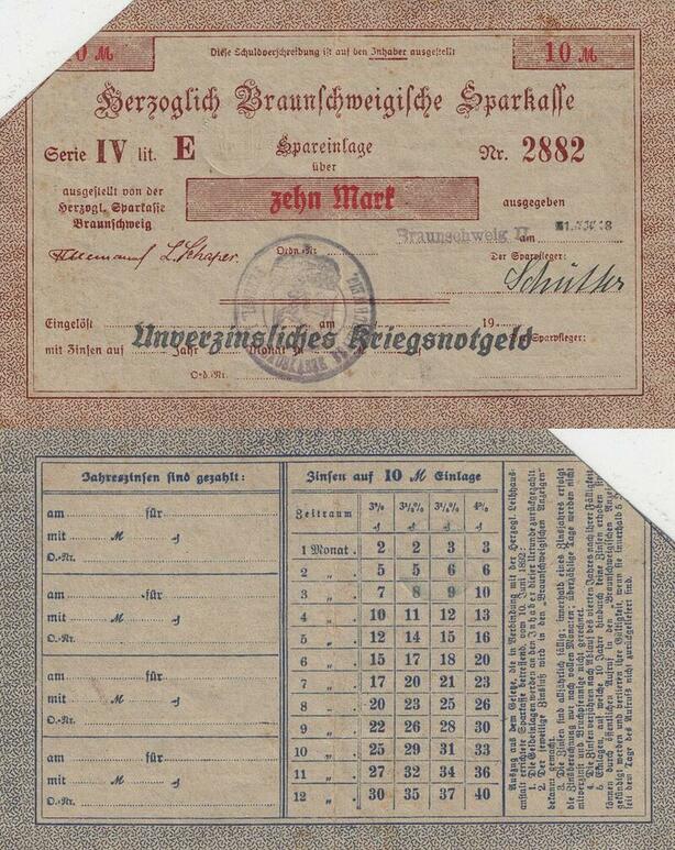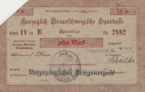 Q4483 Banknote Germany Braunschweig 10 Mark Sparkasse 1918