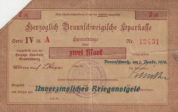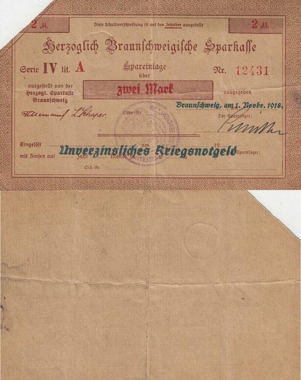 Q4484 Banknote Germany Braunschweig 2 Mark Sparkasse 1918