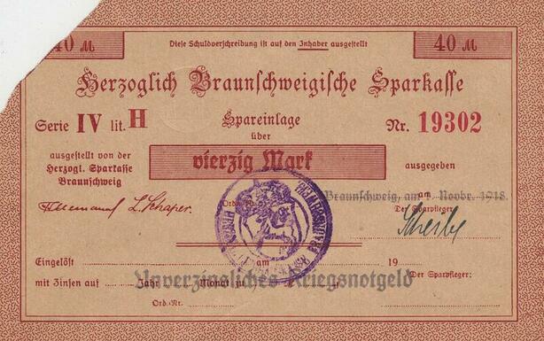 Q4485 Banknote Germany Braunschweig 40 Mark Sparkasse 1918