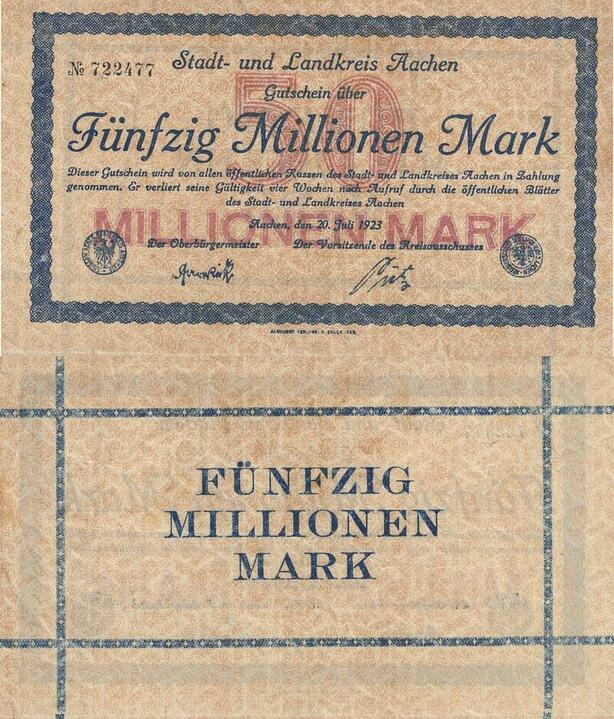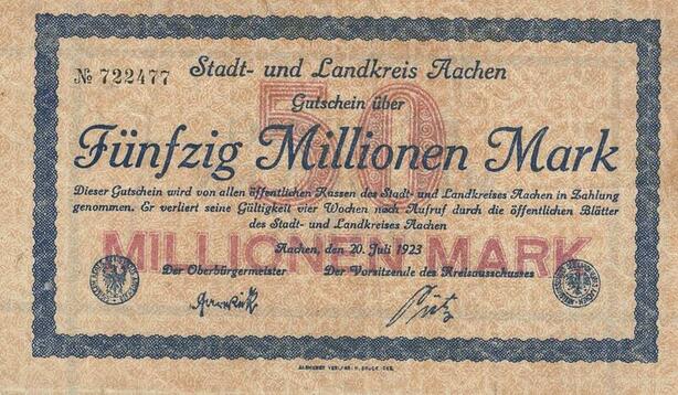 Q4493 Banknote Germany Landkreis Aachen 50 Millionen Mark 1923 Notgeld AU