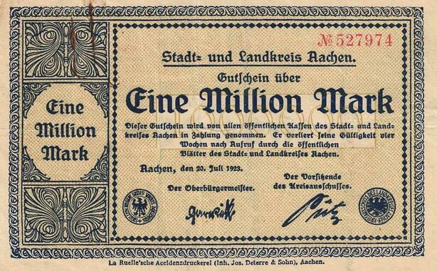 Q4501 Banknote Germany Landkreis Aachen 1 Million Mark 1923 Notgeld - Make Offer