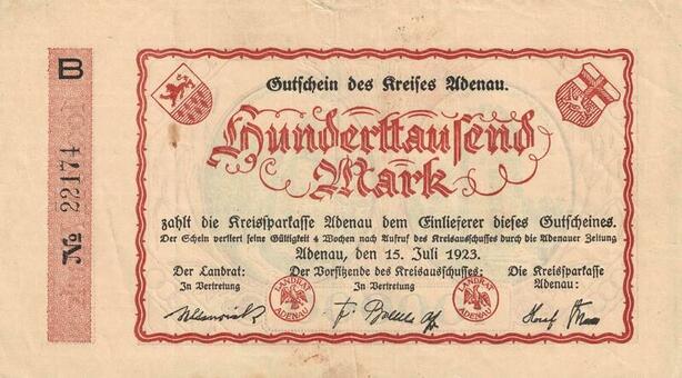 Q4505 Banknote Germany Adenau 100000 Mark 1923 Notgeld - Make Offer
