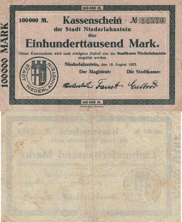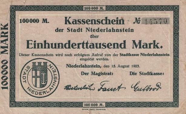 Q4510 Banknote Germany Niederlahnstein 100000 Mark 1923 Notgeld - Make Offer