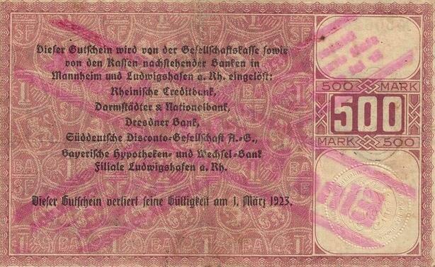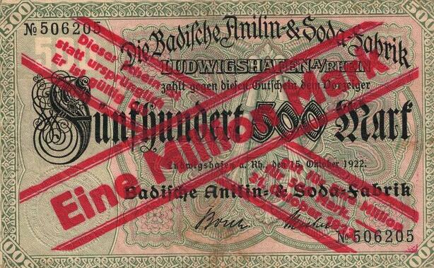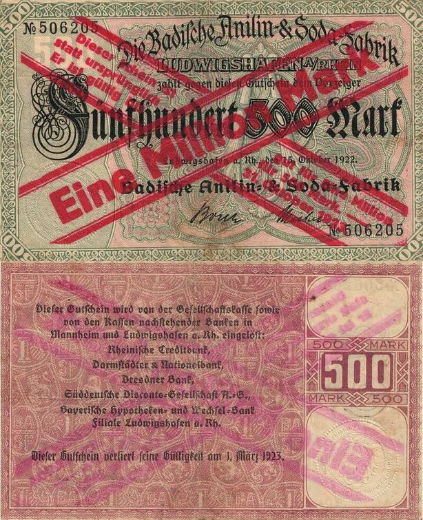 Q4515 Banknote Germany Ludwigshafen 500 / 1 Million Mark 1923 Soda Fabrik