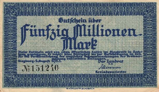 Q4533 Banknote Germany Siegburg 50 Millionen Mark 1923 Notgeld - Make Offer