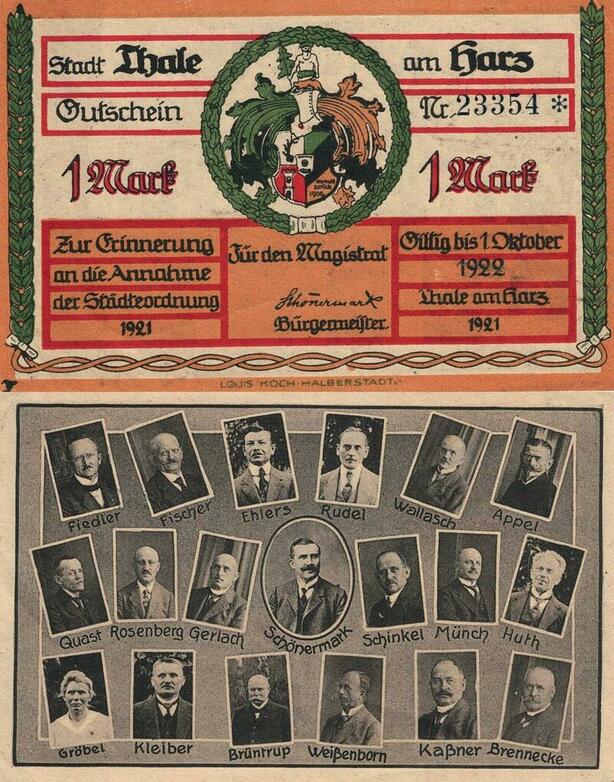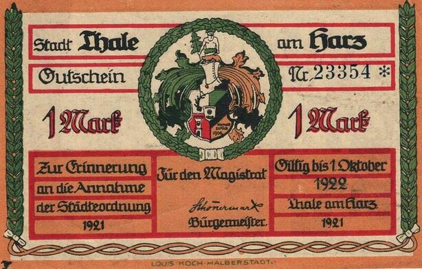 Q4538 Banknote Germany Thale am Harz 1 Mark 1921 Notgeld AU - Make Offer