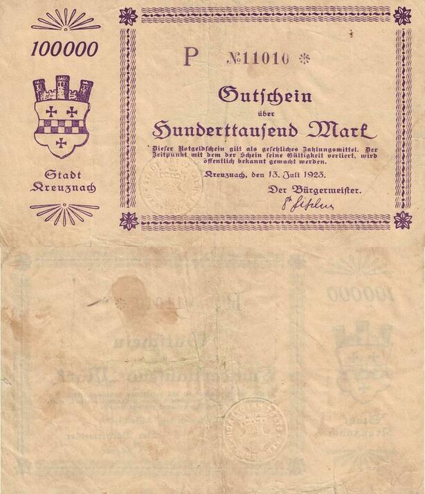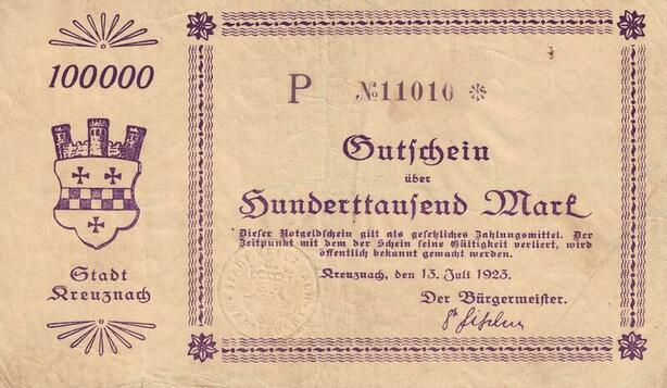 Q4552 Banknote Germany Bad Kreuznach 100000 Mark 1923 Notgeld - Make Offer