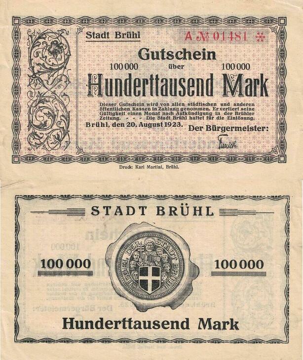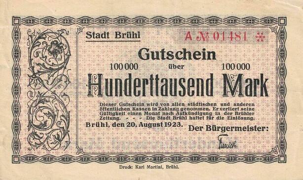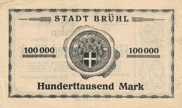 Q4564 Banknote Germany Brühl Stadt 100000 Mark 1923 Notgeld - Make Offer