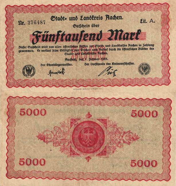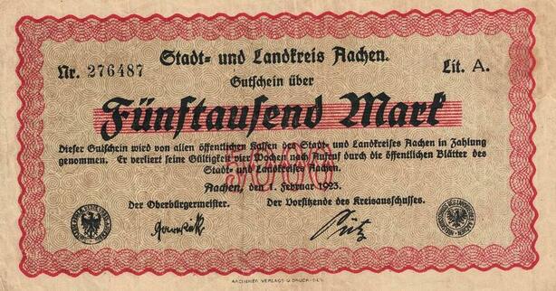 Q4568 Banknote Germany Aachen Landkreis 5000 Mark 1923 Notgeld - Make Offer